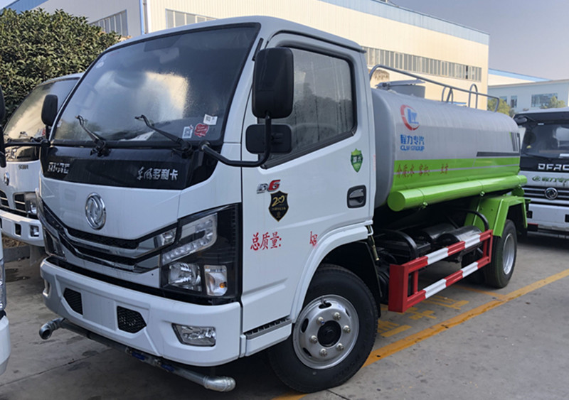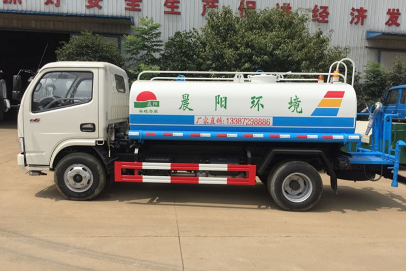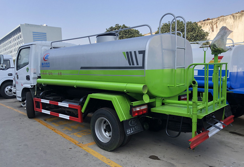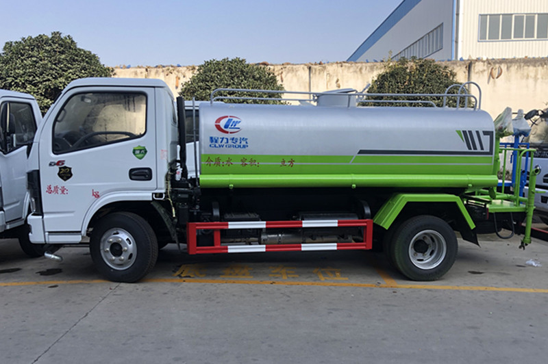 采用東風股份公司原裝底盤,國六發動機,7.00R16的鋼絲輪胎,帶ABS,帶空調。帶前沖、后灑、側噴、高位花灑,后部帶平臺,平臺上安裝綠化灑水高壓炮(炮噴射形狀可調:直沖狀、大雨、中雨、毛毛雨,可連續調節),配備大功率40/45專用灑水泵,帶消防接頭,帶自流閥,帶自吸功能,帶濾網。吸程≥6米、灑水寬度≥14米、45度角時灑水炮噴射距離可達25-30米。 罐體實際容積5噸,全部采用4mm國標碳鋼板, 前后封頭采用國家標準焊接,機械折邊,一次性壓制成型。整罐為直縫焊一次成型,圓弧形對接焊封頭,抗沖擊力和拉力強。罐體的截面形狀為橢圓形或方圓形,內部制造成多倉室結構,各個倉室用加強防波隔板隔開,以減輕汽車行駛時罐體內水的沖擊和提高罐體的強度。隔板與罐體之間采用焊接剛性連接形式,防浪板包邊處理,隔板下端有通孔。罐體的頂部開有出入孔。
